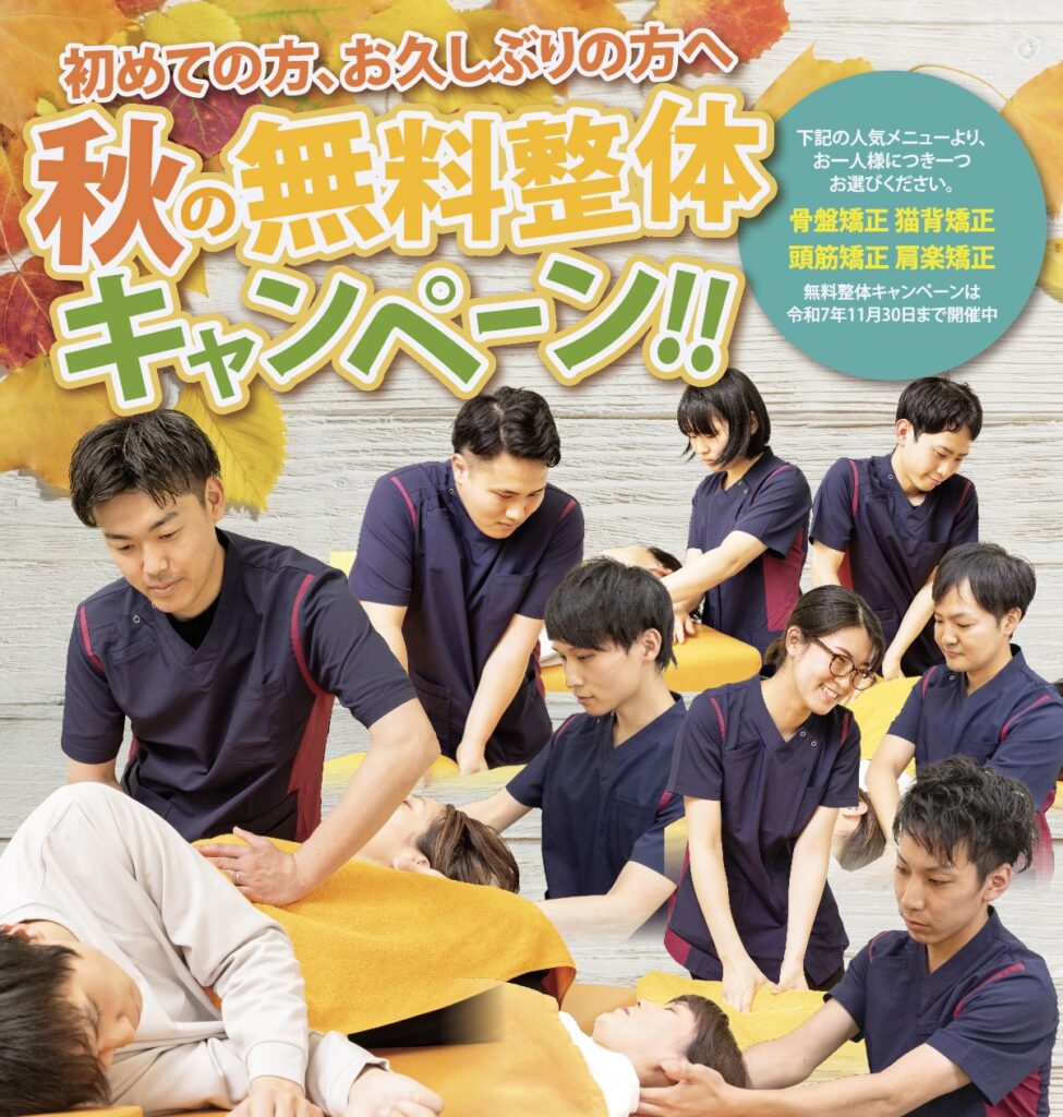 お電話での予約時、またはご来院の際には、「無料整体キャンペーン」とお伝えください。